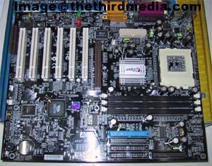 Pro266的主板——AX37Pro,它的黑色PCB板非常吸引人,给人一种很酷的视觉效果。建基AX37Pro主板配置上与前面提到的奔驰FC-266D、硕泰克65DRV两款主板差不多:支持Socket370的PIII、赛扬和VIA